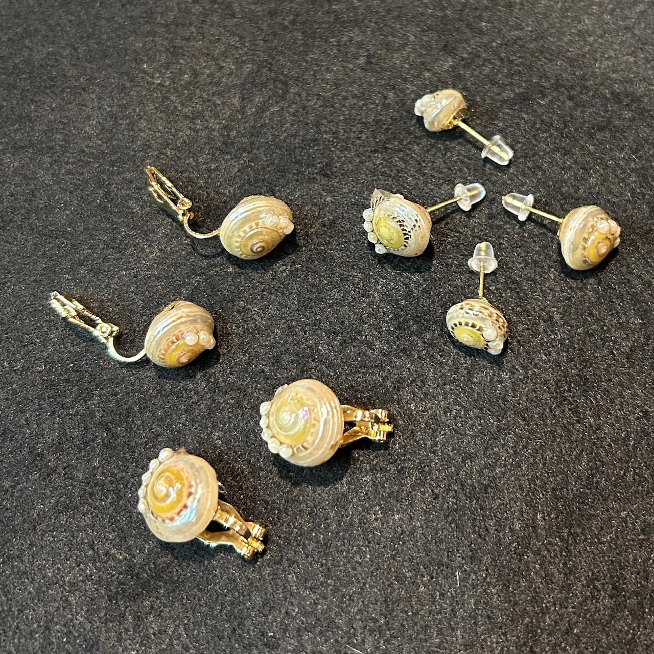 巻貝のイボキサゴ、表面が少し磨かれ真珠層がでています。約2mmサイズのベビーパールを組み合わせピアスとイアリングにしました。水に濡れた時をイメージしレジンでコーティングしています。自然の美しさをお楽しみください。