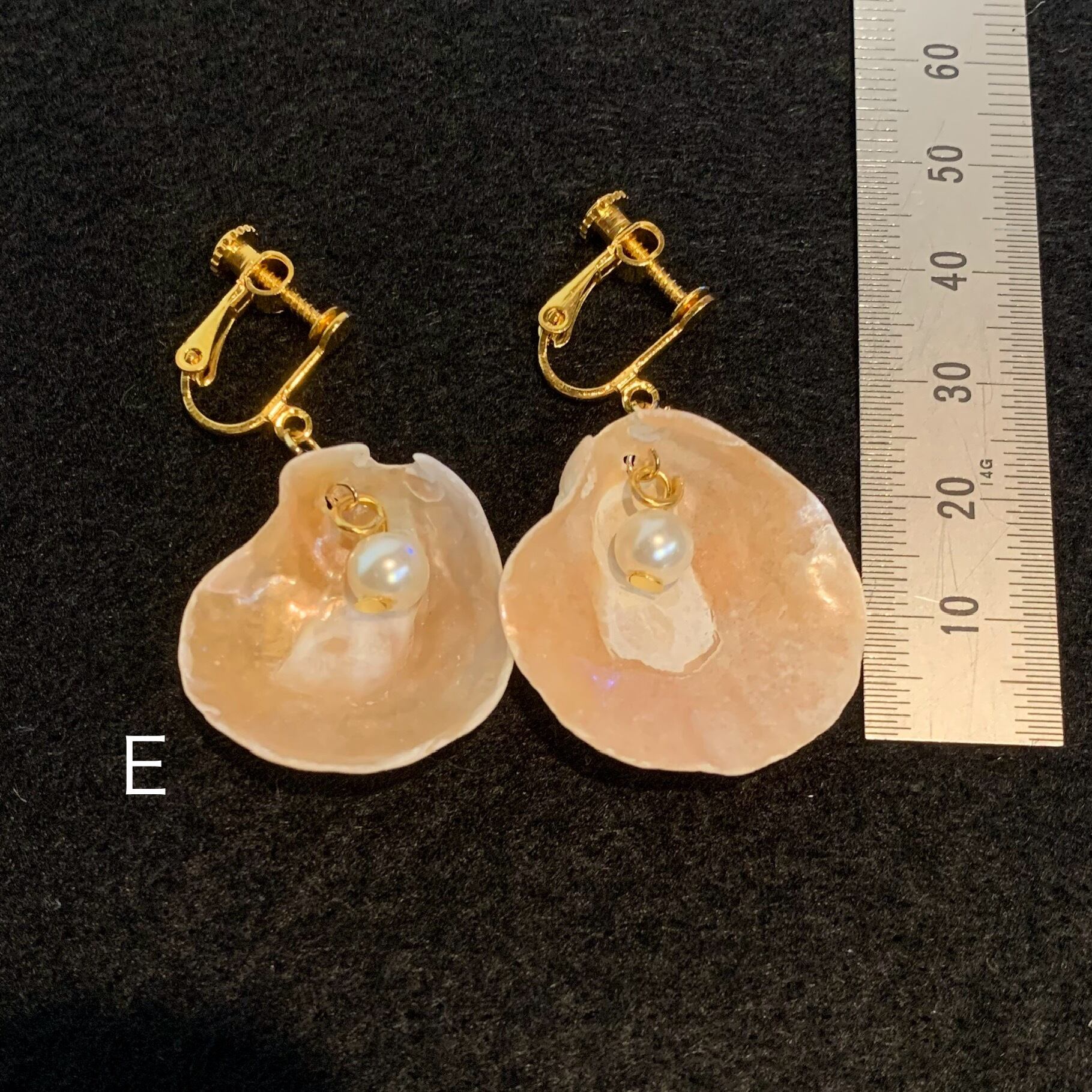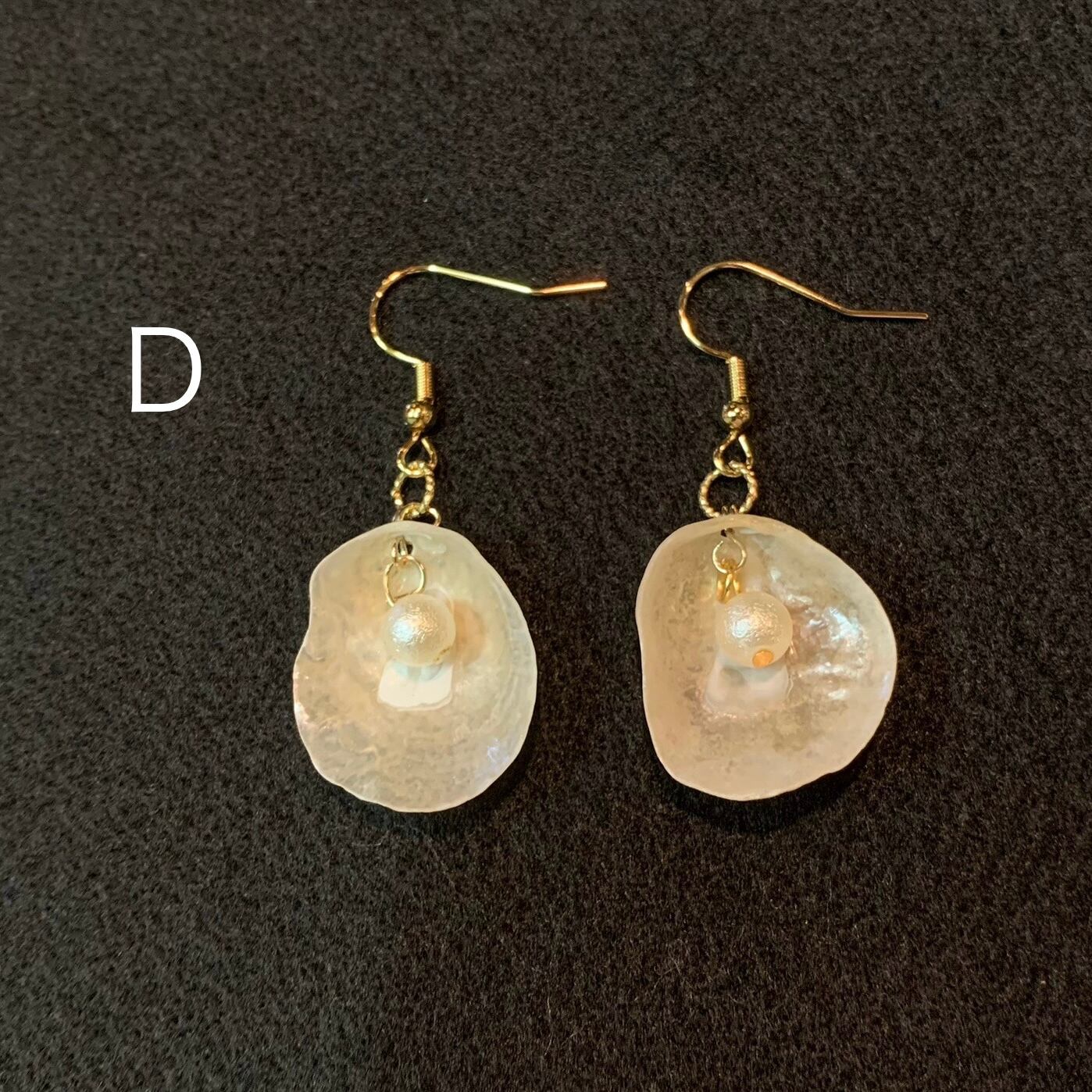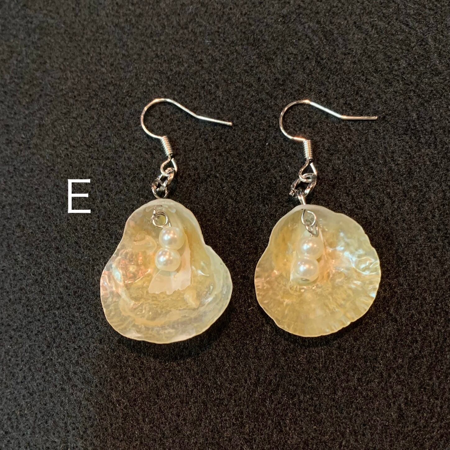 自然の美しさが際立つ二枚貝ナミマガシワを使ったイアリングとピアスです。形、色がすべて違うので、世界に一つだけのアクセサリーです。パールはイミテーションです。
